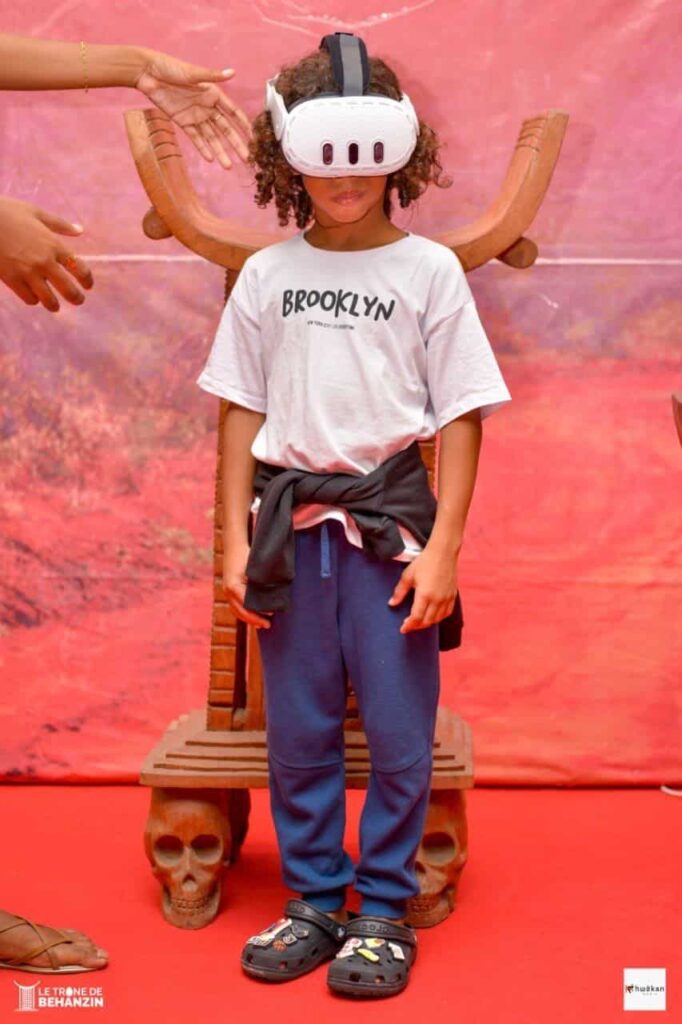 Plus qu’un spectacle, Le Trône de Béhanzin a proposé une expérience multidimensionnelle. Dès leur arrivée, puis à la fin de la représentation, les spectateurs ont été invités à découvrir une innovation inédite au Bénin : une plongée en réalité virtuelle dans des scènes de la vie royale du Danxomè. Grâce à des casques immersifs, le public a pu traverser des espaces et des époques, entre cérémonies, architecture royale et scènes du quotidien, pour mieux saisir l’ampleur de l’univers dans lequel s’inscrit l’œuvre.